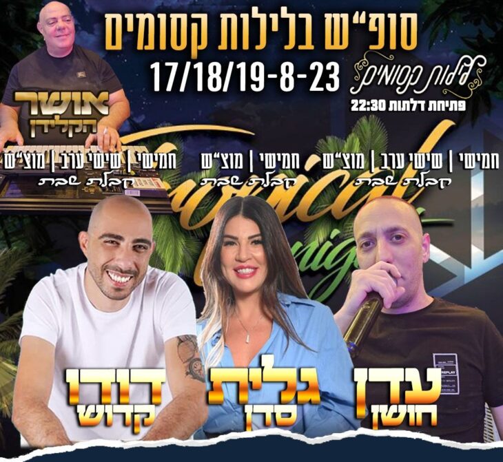 חמישי-מוצ"ש, 19-18-17.8. פתיחת דלתות: 22:30.