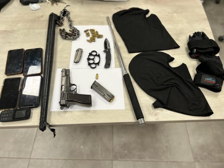 בחיפוש ברכב ועל גופם של החשודים נתפסו אקדח FN טעון עם כדור בקנה, סכינים, אלות, רעלות פנים ומחסניות תחמושת לא חוקיים.