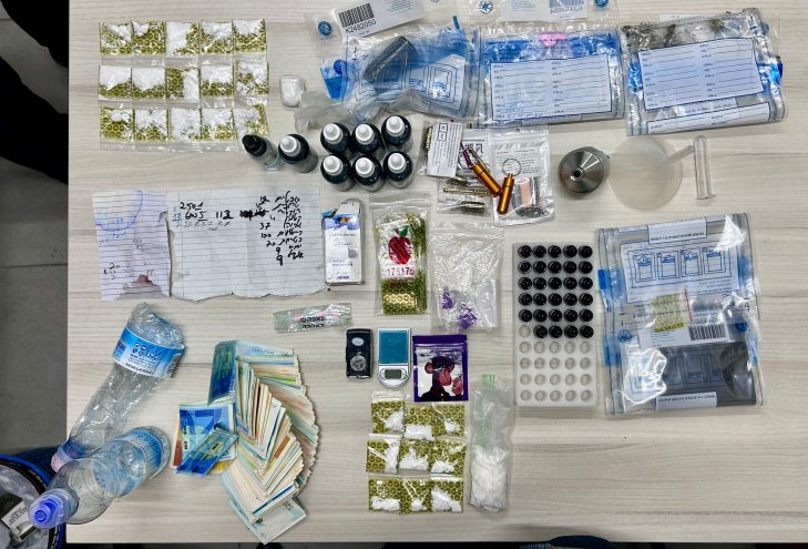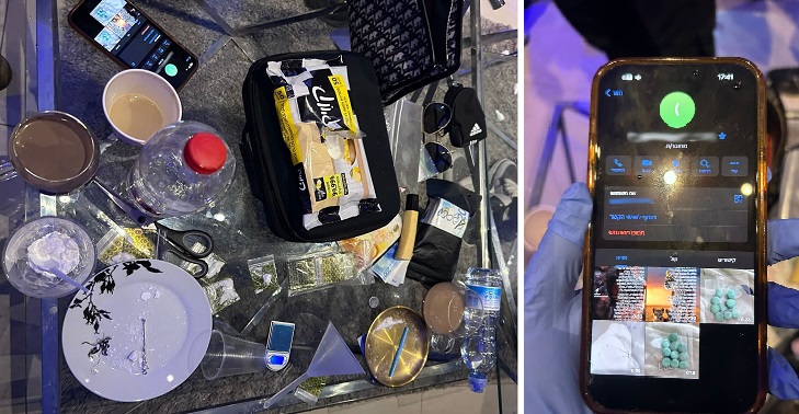 הבלשים השתלטו על החשודים ותפסו בדירה חומרים רבים החשודים כסמים מסוגים שונים: קוקאין, מריחואנה, אקסטזי, mdma, ghb, ציוד לחלוקה, משקלים אלקטרוניים וכ-15 אלף שקל במזומן.