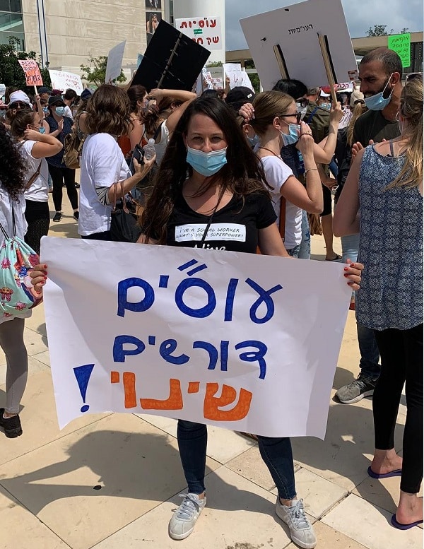 ענבל אדוני היא עובדת סוציאלית במחלקת הפנימית בבית החולים העמק בעפולה. היא (36 נשואה ואם לשלושה ילדים, אבל פעילה במאבק העובדים הסוציאליים והגיעה להפגנה. "לא באנו לעבוד במקצוע הזה בשביל השכר", היא אומרת ל"פוסטה" בדרך להפגנה. "כל אחד הולך לעבודה שמעניינת אותו אבל בסוף כל חודש כשפותחים את תלוש המשכורת ורואים שכר של 6,700 שקל יחד עם הניסיון שיש לי זה מגוחך ומביש. יש לי שלושה תארים, תואר ראשון בפסיכולוגיה ותואר ראשון ושני בעבודה סוציאלית. אני עובדת ב-75 אחוז משרה, בקרב עובדים סוציאליים זה נחשב למכובד, כי אין כמעט תקנים של משרה מלאה. אין יום שבו אני לא עובדת מעבר ל-75 אחוז, אני תמיד מגיעה לפני שעות העבודה והולכת אחריהן.