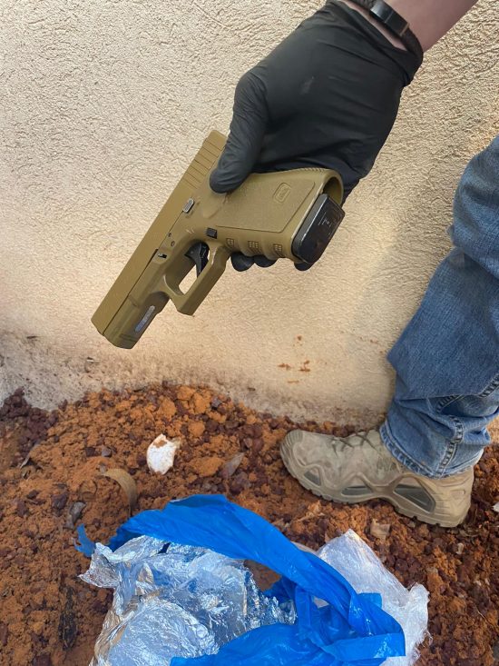 בחיפוש בביתו של האב ובסמוך אליו תפסה המשטרה אקדח טעון וגם אקסטזי וקנאביס בכמות שלא לצריכה עצמית.