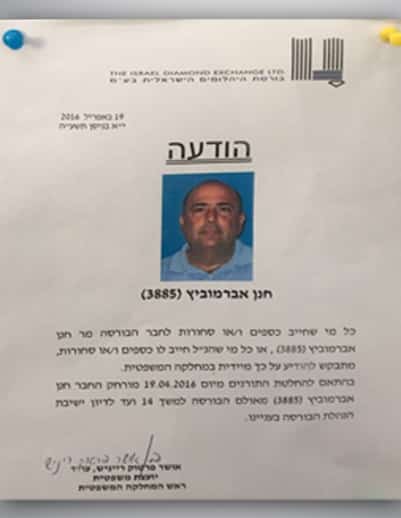 אברמוביץ (57) מראש העין ניהל משרד בבורסה ליהלומים ברמת גן במשך 30 שנה, בהן רכש את אמונם של סוחרי הבורסה. מומחיותו היתה בתיווך עסקאות ואיתור רוכשים, בעיקר במזרח הרחוק. סוחרי הבורסה היו מוסרים לידיו יהלומים במיליוני דולרים, על מנת שימכור אותם כמתווך תמורת עמלה. כמקובל בענף, ההסכמים לרבות סיכום מחיר המכירה נערכו בעל פה, אך אברמוביץ חתם על פתקי memo המפרטים את תאריך העברת היהלומים לידיו, טיב היהלומים (קראט ומשקל) והשווי שלהם. הפתק שימש אישור לכך כי קיבל את היהלומים בנאמנות לשם מכירתם והתחייבותו להעברת סכומי המכירה, בקיזוז העמלה שלו, לסוחרי היהלומים.