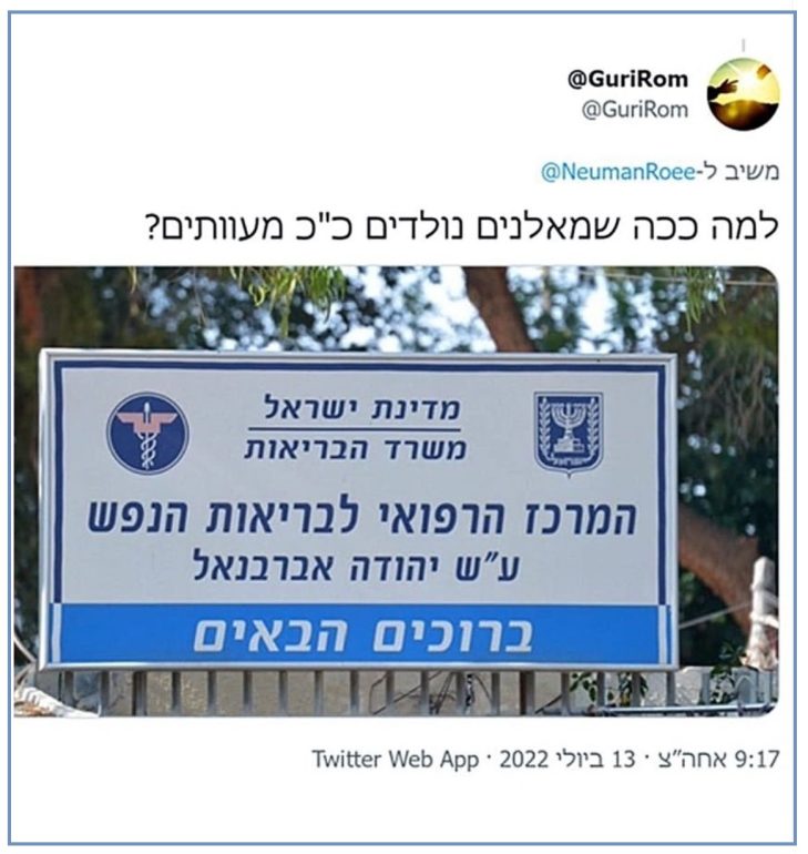במקרה אחר, גור פרסמה תמונה של שלט הכניסה למרכז הרפואי פסיכיאטרי "אברבנאל", ומעליו הכיתוב המשניא: "למה שמאלנים נולדים כל כך מעוותים?" .