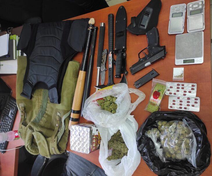 הכוחות תפסו בחיפושים אקדח CZ עם תחמושת, מחסנית M16, סכינים, שכפ"צים, כלי תקיפה וסמים מסוגים שונים בהם חשיש, קוקאין ומריחואנה במשקל כולל של יותר מ-900 גרם.