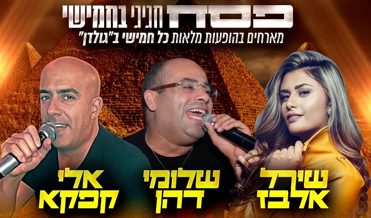 פסח חגיגי. שירל אלבז, שלומי דהן, אלי קפקא. חמישי, 6.4, פתיחת דלתות: 22:30. גולדן, מנחם בגין 17, ת"א