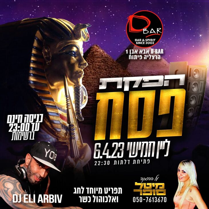 DJ: ELI ARBIV. מפיקה: מיטל סופר. פתיחת דלתות: 22:30. כניסה חינם: עד 23:00. D BAR, אבא אבן 1, הרצליה פיתוח