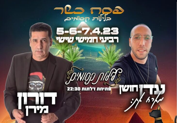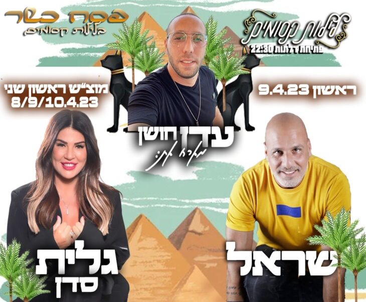 פסח כשר בלילות קסומים. עדן חושן מארח את שראל וגלית סדן. מוצ"ש-ראשון-שני, 10-9-8.4, פתיחת דלתות: 23:00. לילות קסומים, דרך הים 7, אילת