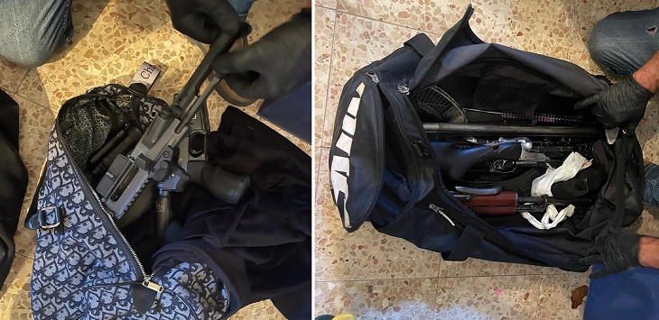 השוטרים ביצעו חיפוש ממוקד בגן ילדים בעיר, בסיוע יחידת הכלבנים וחבלנים. בחיפוש הם מצאו במחסן הגן שני רובי קלאצ'ניקוב, רובה M16, מקלע "קרלו", רובה צייד, כ-1,000 כדורי תחמושת, חלקי נשק נוספים ועשרות אלפי שקלים במזומן.