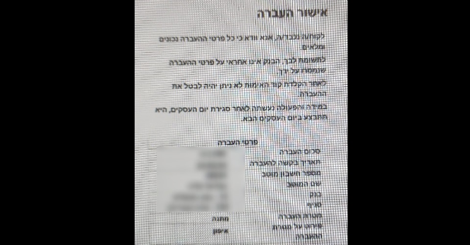 "משטרת ישראל קוראת לציבור המבצע עסקאות, לוודא את הפקדת הכסף בחשבון הבנק טרם העברת מוצר ולהימנע מהסתמכות על אישור העברה כזה או אחר הניתן לזיוף", נמסר מהמשטרה.