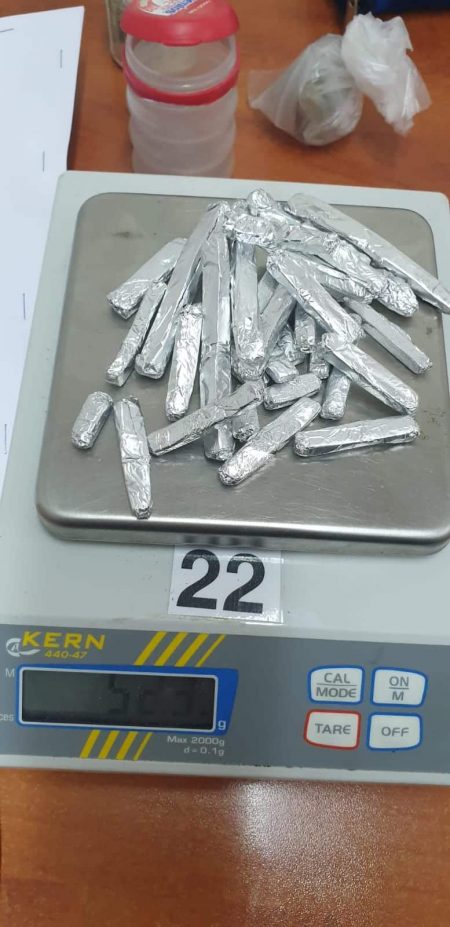 השוטרים מצאו מטען צינור (2 צול, אורך 40 ס"מ) מוכן להפעלה, אקדח 9 מ"מ ומחסנית, 7.5 ק"ג חשיש, שני רימוני הלם, 125 גרם מריחואנה, 137.8 גרם MDMA.