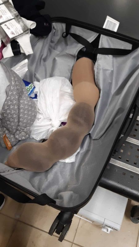 בתחתית מזוודה השייכת לישראל נמצאה כרית לצוואר שהכילה שש חבילות מחולקות ובהן 1,285 זרעים במשקל כולל של כמעט 1.8 ק"ג. בתחתית תיק נסיעות שחור של אלקיים נמצאה כרית צוואר שהכילה חמש חבילות מחולקות ובהן 934 זרעים במשקל כולל של כמעט 1.5 ק"ג. ובסך הכל: כמעט 3.3 ק"ג זרעי קנאביס.