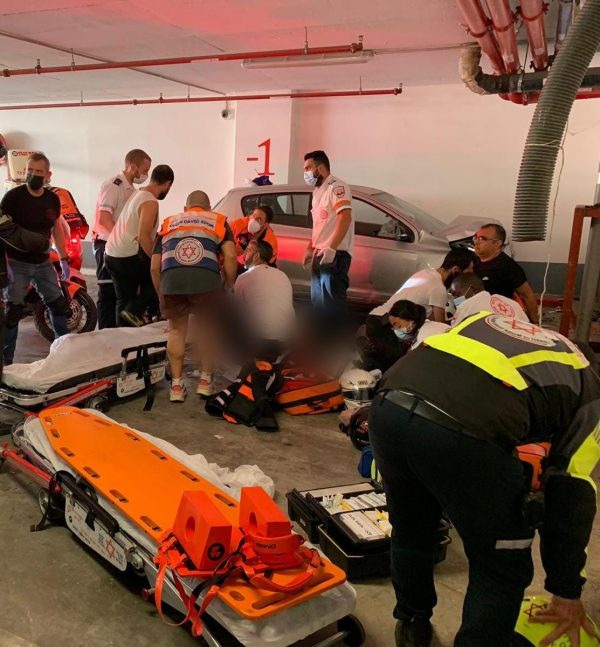 החובשים של מד"א, דניאל גיאת ונתן רוס, שהגיעו למקום רכובים על אופנועי מד"א, סיפרו: "הגענו לכניסה לחניון וראינו את הרכב שהתנגש בקיר עם פגיעות קשות בחלקו בקדמי. נהגת הרכב היתה מחוסרת הכרה, ללא דופק וללא נשימה. חילצנו אותה מהרכב וביצענו פעולות החייאה מתקדמות אבל הפציעה היתה קריטית ובסופן נאלצנו לקבוע את מותה. גבר כבן 80 חולץ מהמושב שליד הנהג ואישה חולצה מהמושב האחורי. הענקנו להם טיפול רפואי ראשוני בשטח ופינינו אותם להמשך טיפול בבית החולים כשמצבם בינוני וקשה. במהלך הפינוי לבית החולים מצבה של הפצועה הדרדר וביצענו בה פעולות החייאה".
