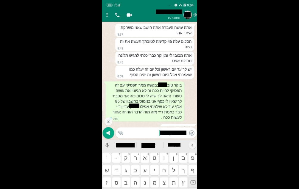 מהדיונים בבית המשפט עלתה תמונה קצת שונה. החשוד סיפק לחוקריו גרסה ולטענתו הוא נסחט על ידי המתלוננת ואימה. לדבריו, המתלוננת תועדה כשהיא פורצת לעסק וגונבת כספים מהקופה, ולכן הוא אף הוציא נגדה צו הרחקה. כמו כן הוא טען, כי לאחר המהלך הזה שלו, הנערה ואימה ניסו לסחוט ממנו סכומי כסף גדולים. הוא אף הראה לחוקרים את ההודעות ששלחה לו אימה של המתלוננת, שכתבה לו בין היתר: "סגרתי איתה 40,000 שקלים ובזה נגמר הסיפור".
