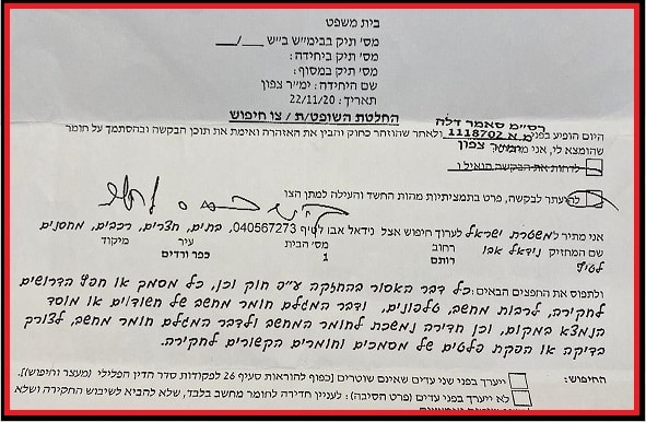 צו חיפוש שהוצא לביתו של נידאל אבו לטיף בכפר ורדים לבקשת ימ"ר צפון