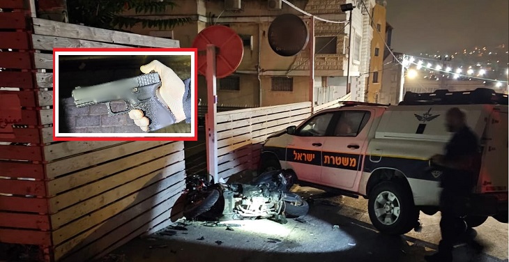עד מהרה התקרית התפתחה למרדף שבמהלכו התנגש הקטנוע בניידת משטרה, ושני החשודים נפצעו באורח בינוני וקשה. במקום אף נתפס אקדח מסוג גלוק טעון עם כדור בקנה.