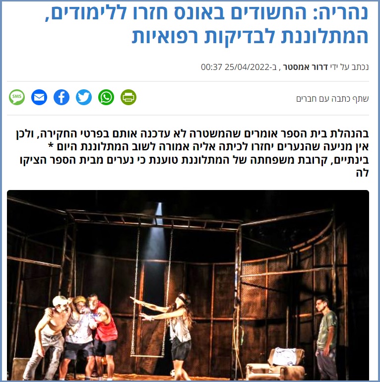 הנערים החשודים באונס הקבוצתי של הנערה בת 13 בנהריה חזרו למחרת חופשת הפסח ללימודים כרגיל, בעוד שהנערה אשר נפגעה וחשפה את הפרשה החמורה נעדרה מלימודים עקב בדיקות מיוחדות שהיא נדרשה לעבור ביום הראשון ללימודים, במחלקה מיוחדת של אחד המרכזים הרפואיים הגדולים בצפון (24 אפריל). כך נודע לאתר "פוסטה" שחשף את הפרשה.