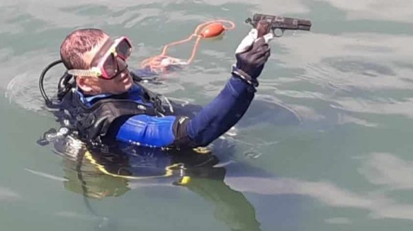 צוללן משטרתי עם האקדח שנמשה מקרקעית הים