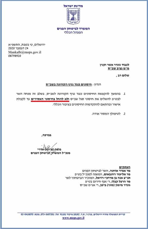 במכתב עליו חתם מנכ"ל המשרד לבטחון פנים, משה צ'יקו אדרי, נכתב כי השר מנחה "להשלים את חיסוני סגל שב"ס ולא להחל בחיסוני האסירים (ההדגשה במקור) עד לקבלת אישור ובהתאם להתקדמות החיסונים בציבור הכללי".