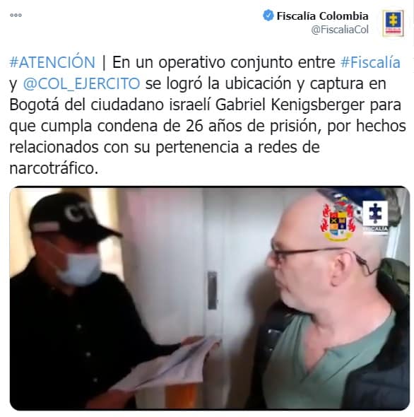 לפי הפרסום של התובע הכללי בקולומביה, העצור הוא גבריאל קניגסברגר, שעומד בפני 26 שנות מאסר. הוא נלכד במבצע משותף של מספר רשויות ובסיוע מידע ממשטרת ישראל. באוקטובר האחרון הוא הואשם בבית המשפט בבוגוטה כאחראי לקשירת קשר חמורה, סחר, החזקת סמים והלבנת הון. לפי הרשויות בקולומביה, עבירות הסחר בסמים התבצעו בצרפת, בהולנד ובישראל.