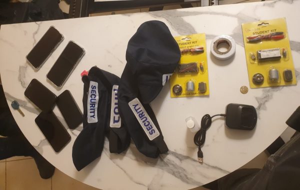 בתוך הדירה איתרו השוטרים כובעי זיהוי עם הכיתוב "בטחון", טלפונים ניידים ורכיבים אלקטרוניים שעל פי החשד היו אמורים לשמש להרכבת מטעני חבלה.
