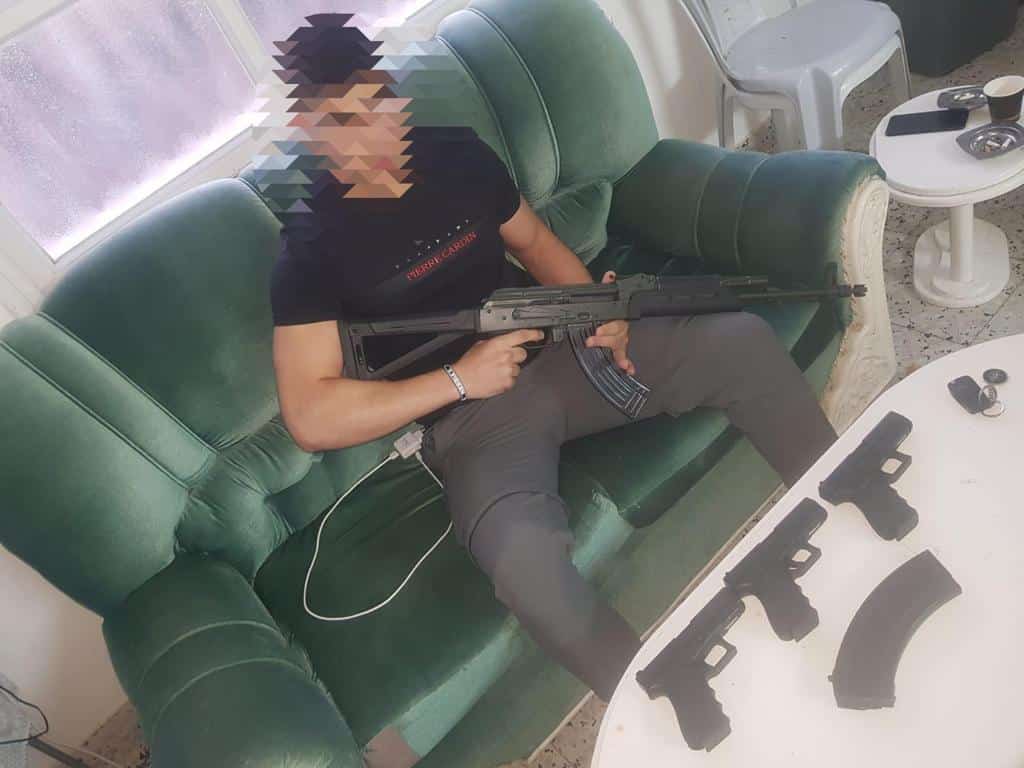 תיעוד של אחד החשודים לצד אמצעי לחימה שהיו ברשותו בתקפת החקירה (צילומים: משטרה)