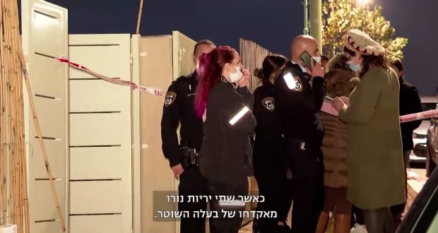 כוחות ביטחון ותקשורת מגיעים אחרי הרצח. חצר הבית של משפחת רז (צילום מסך חדשות 13)