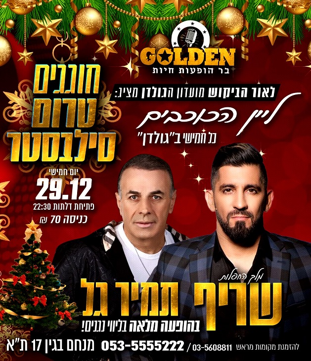 שריף ותמיר גל, אלופי החפלות, במסיבת טרום סילבסטר. חמישי, 29.12. פתיחת דלתות: 22:30. מועדון הגולדן, מנחם בגין 17, ת"א