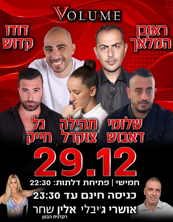 ראובן המלאך, דודו קדוש, שלומי דאבוש, תהילה צוקרל, גל חייק ורקדנית הבטן אלין שחר. חמישי, 29.12, פתיחת דלתות: 22:30. מועדון Volume, דרך המכבים 16, ראשל"צ