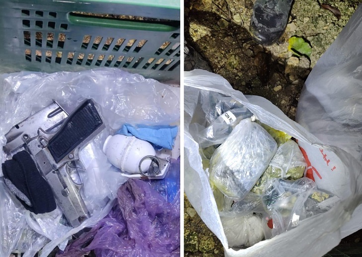 מלבד האקדח השוטרים תפסו גם רימון יד. כאמור, נתפסו סמים מסוגים שונים: 1.5 ק"ג מריחואנה, 870 גרם חשיש ו-400 כדורי אקסטזי שהוסלקו בבית.