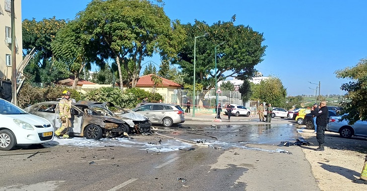 לוחמי אש מתחנת נתניה פעלו להשתלט על להבות ענק מהרכב בו אירע הפיצוץ ורכב נוסף שחנה בסמוך ועלה באש.