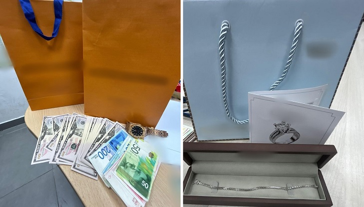עוד נטען, כי בחיפוש באחד הבתים נתפסו מותגים שנרכשו: תיקים, חולצות, נעליים וצמיד כסף.
