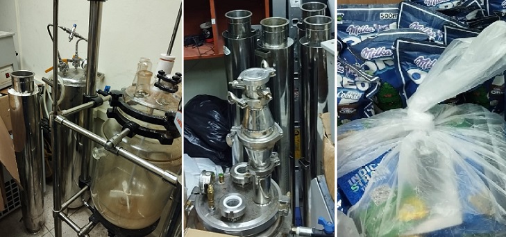 השוטרים ערכו תצפית על שני חשודים שעמדו סמוך למחסן בעיר. בחיפוש במתחם נמצא כי המקום משמש גם כמעבדה לייצור סמים מסוג אמפטמינים ושמן קנאביס, וגם לאחסון סמים טרם הפצתם.