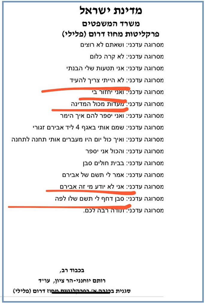 "אני את הטעות שלי הבנתי. אתם גרמתם לי להעיד שלא ברצוני. בבית החולים סבן (אייל סבן, ראש צוות החקירה בימ"ר נגב) אמר לי את השם של אבירם. אני לא יודע מי זה אבירם. סבן דחף לי את השם שלו לפה".