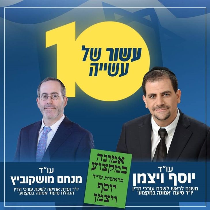 מודעת הבחירות של יוסף ויצמן ומנחם מושקוביץ בקמפיין 23' ללשכת עורכי הדין