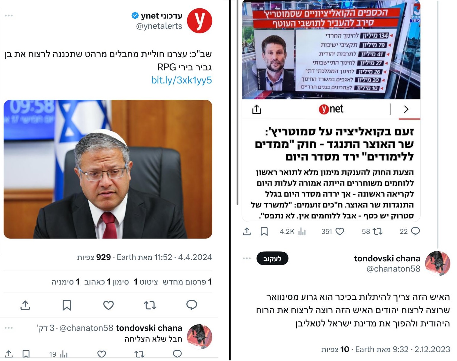 כך למשל, בתגובה לפרסום היום על חוליית מחבלים שנעצרה בחשד שתכננה לרצוח את השר בן גביר, פורסמה תגובה בה נכתב: "חבל שלא הצליחה" (4 אפריל). בתגובה נוספת נכתב מאותו חשבון נכתב: "אני מציעה לערבים לחטוף את בן גביר וסמוטריץ'".