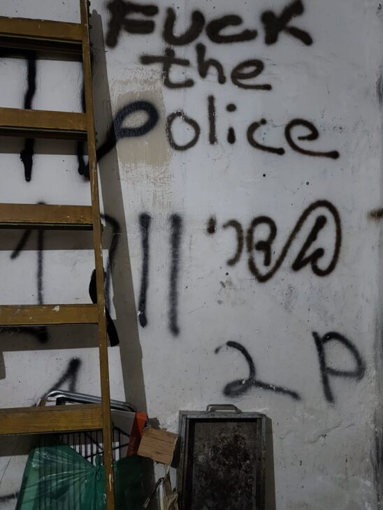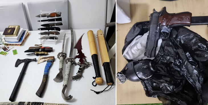 במהלך החיפוש תפסו השוטרים אקדח, תחמושת קליעית, רימון תרגול שעבר הסבה כך שיש לו "יכולת פגיעה", ולמעלה מ-10 חרבות, סכינים ואלות. בחיפוש שנערך במחסן השייך לחשוד התגלו גם כתובות בגנות המשטרה.