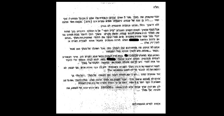 המנהל מוגדר במכתב כ"יהודי אשר העסיק את בעלך הרבה שנים ושילם לבעלך את כל מה שמגיע לו… וזאת על פי הסכם פשרה של בית הדין לעבודה". על המכתב חתומים, "אנשים יהודים שאכפת להם".