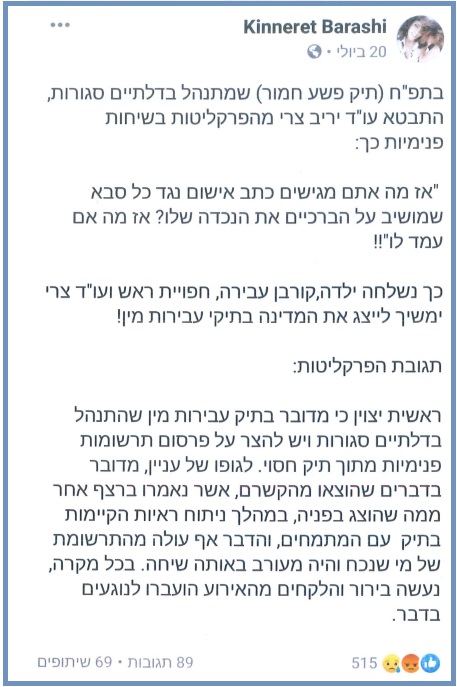 פרקליט בכיר במחוז דרום הגיש תביעה על סך 300 אלף שקל נגד עורכת הדין כנרת בראשי, בעקבות שלושה פרסומים שפרסמה נגדו ברשתות החברתיות ובתוכנית רדיו, בהם ייחסה לו לכאורה נטיות "פדופיליות" והציגה אותו באופן מבזה, כמי שליבו גס כביכול בפגיעות בקטינים. כך נודע ל"פוסטה".