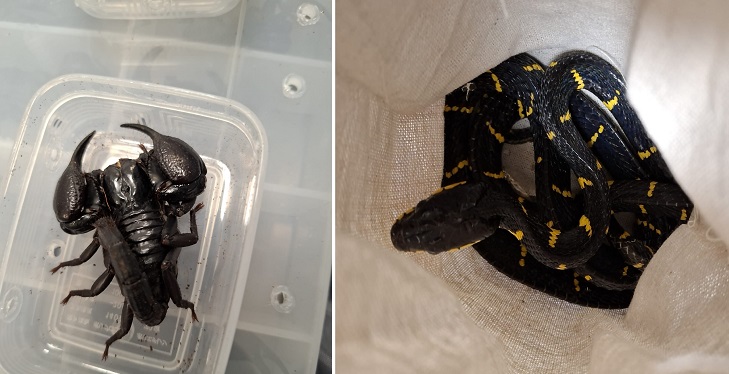 במזוודה נמצא מגוון רחב של מינים אקזוטיים מסוכנים, ביניהם מיני נחשים ולטאות: איגואנות, פיתוני עצים, כוחים, טגו ועקרבים.